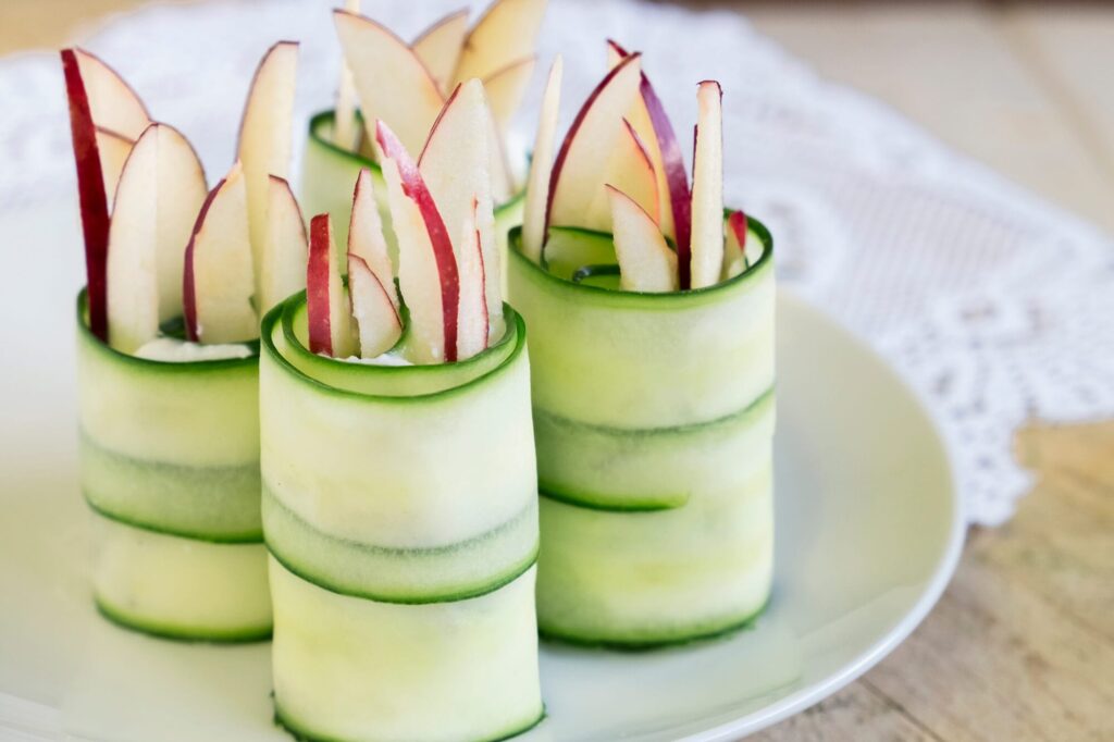 Core and slice the pear into thin slices, leaving skin on for color and flavor. Slice Cucumber into rounds.